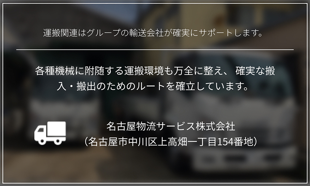 各種機械の搬入・搬出も、状況に応じた車両で、迅速・丁寧かつ柔軟に対応していきます。 -